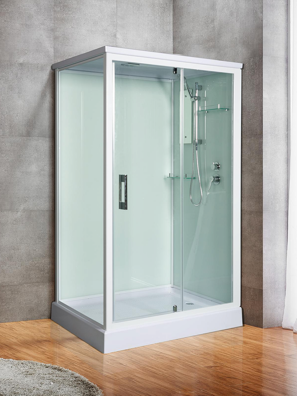душевая кабина с крышей, поддон, смеситель, сифон с гидрозатвором, верхний душ, ручной душ, экран не съемный, зеркало, полки, крепение, гарантийный талон, инструкция